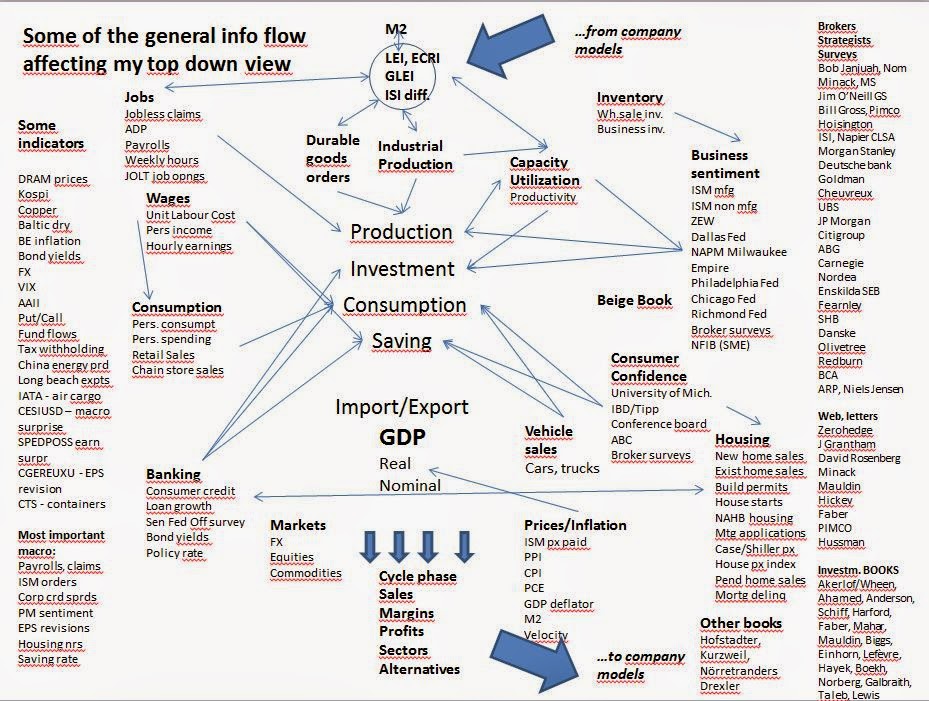Jag fick ofta frågan vad jag använde för input när jag funderade på dels ekonomin och den generella marknaden, dels enstaka aktier. Till slut kladdade jag ganska snabbt ned "några av de saker jag tittade på"; de faktorer som låg närmast till hands och som jag tidigare bara refererat till som "de vanliga" faktorerna som jag antar att alla tittar på.